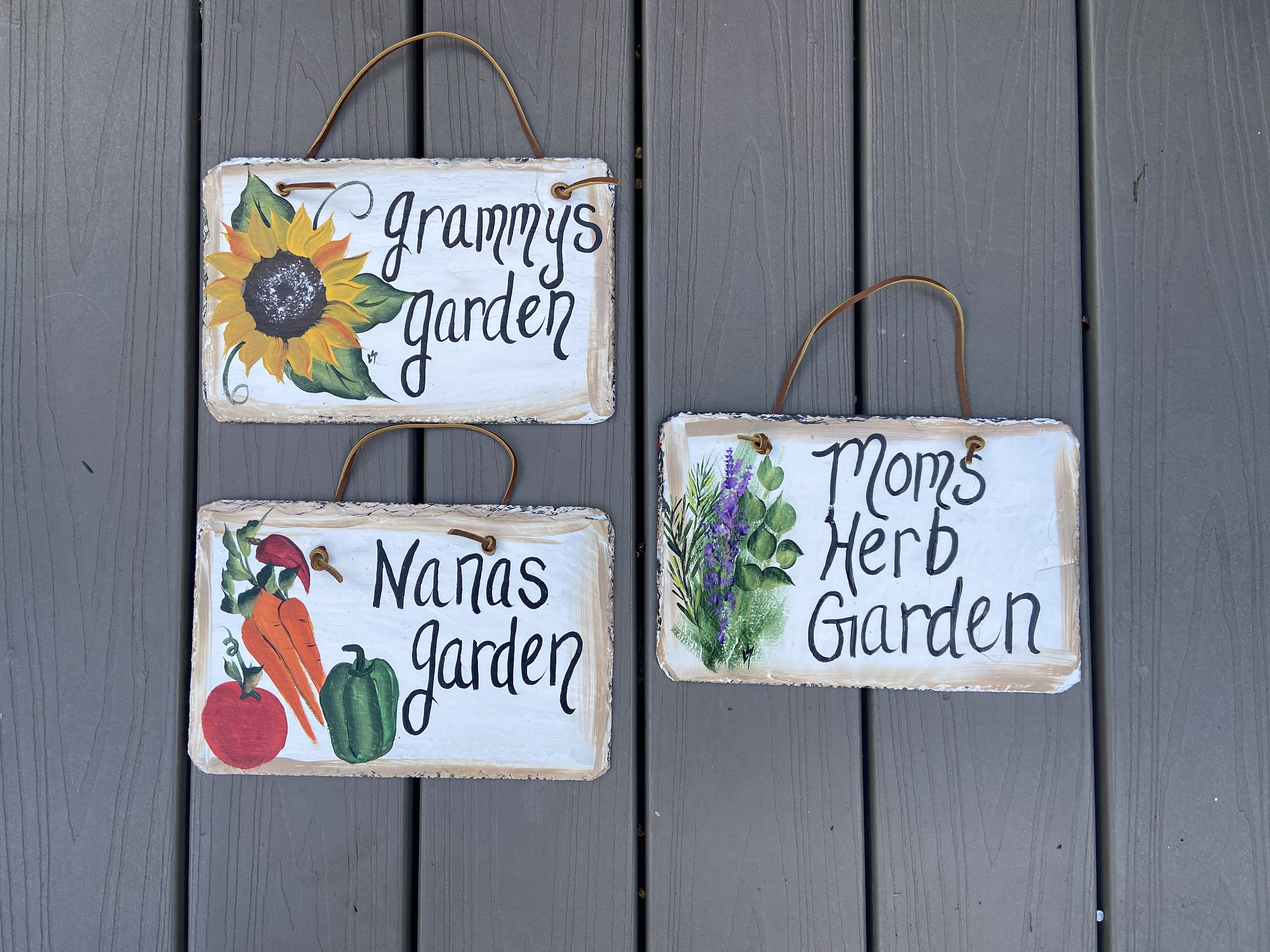 Hand painted little fairy garden signs Available with any wording. Hand Painted Slate Pineapple Welcome sign Pineapple Door hanger Welcome sign Pineapple door sign Painted slate Spring decoration 4700 Hand Painted Slate Garden Signs Personalized garden signs slate garden signs Slate plaques painted slate gift for mom garden decor 2500 Hydrangea Slate sign Spring Welcome sign Front door Slate. I sell the decorative slates in my Etsy store and at local craft shows.