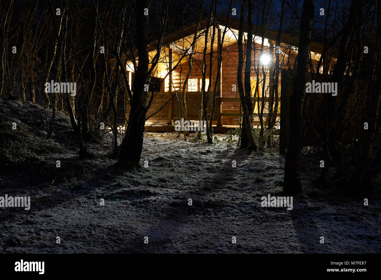 Log Cabin At Night With Lights On In A Forest Stock Photo Alamy