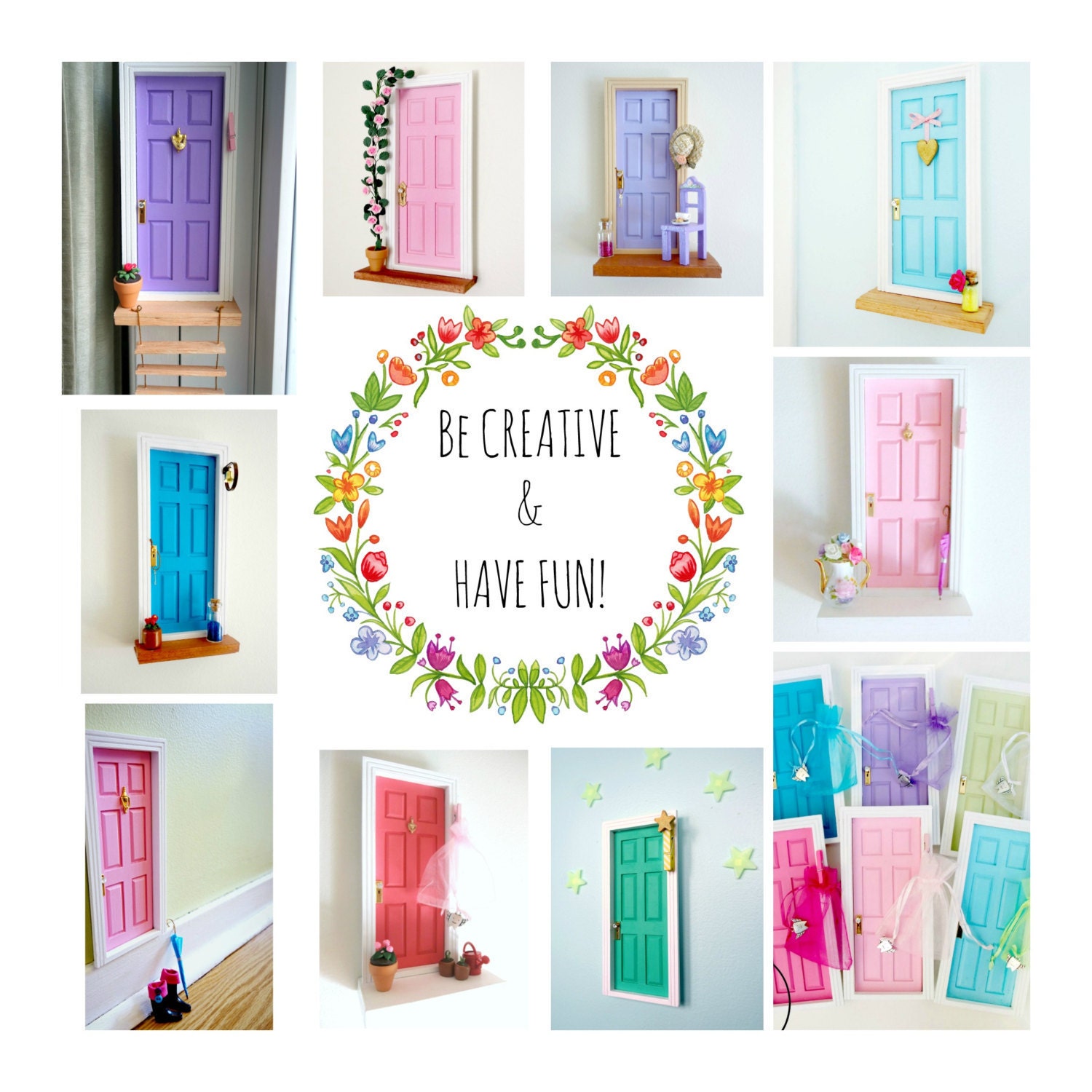Adding a doorknob is the final step for a true fairy door. - an easy to follow and complete instruction leaflet - an unfinished wood door 7H x 33W - a small square of sanding paper - wall mounting tape - a tiny bottle of fairy dust color of your liking -. Create your own Fairy Door with this fun DIY kit.